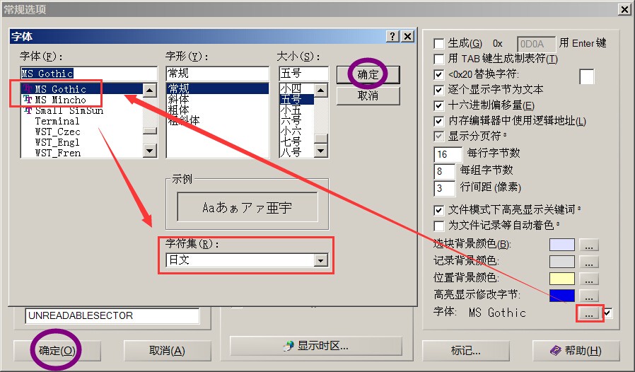 那里设置后,字体选MS Gothic或者MS Mincho,字符集选日文即可。