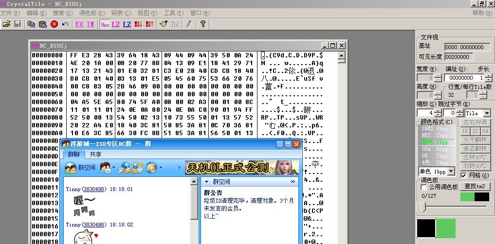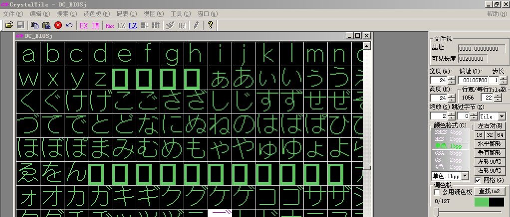 用CrystalTile打开FNT18PTN ,然后按看BIOS字库的方法查看一下,什么嘛,什么也看不清楚,别急,慢慢调,下面还有颜色格式给你选,你搭配着在拼一下看(考验你耐心和细心的时候到了)