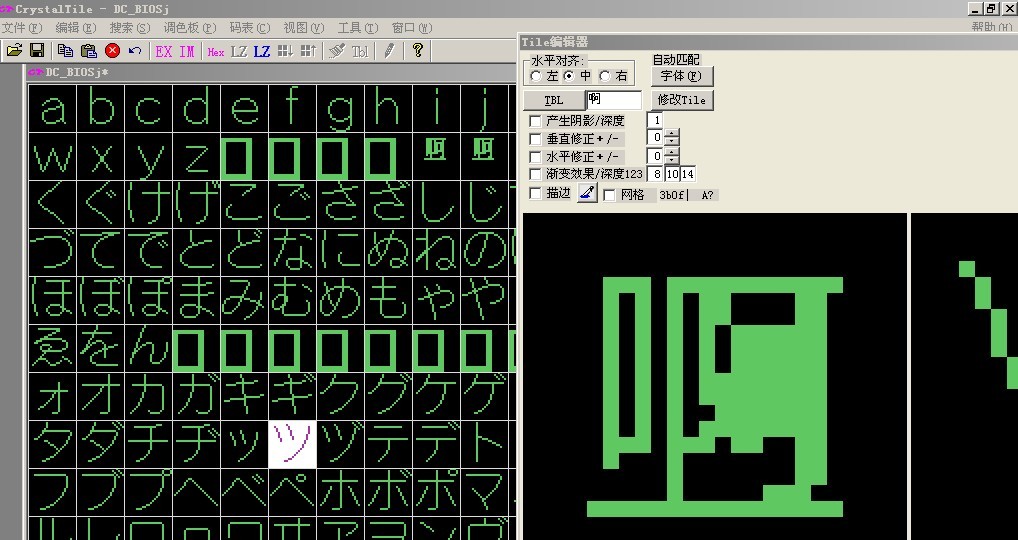 好了,看清楚了吧,在图框里找到那些可恶的日本蝌蚪文,在随便一个日本蝌蚪文上面点一下按Ctrl + D调出Tile编辑器,在TBL旁边的空格处随便打个汉字看图C
