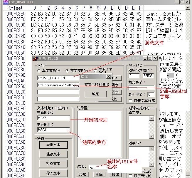 没什么要说明的,字都在图里了,1.打开1ST游戏文件,2.Shift-JIS(B).tbl码表,3.开始结尾地址,4.写上输出的TXT文件名称,5.导出文本就可以了