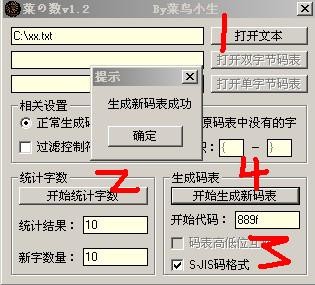 也没什么好说的了,打开刚才的TXT,然后统计字数,统计好以后,在旁边的SJS码格式上打勾,添上开始代码(这个地方很重要,虽然可以随便添,但是在游戏当中有很多重要的代码,如果你的代码和游戏的有冲突的话,嘿嘿,所以建议是从Shift-JIS(B)码的汉字区开始最好,用记事本打开Shift-JIS(B)往下翻你会发现汉字是从889F=亜这开始的,OK,我们就填上889F,然后点开始生成码表。