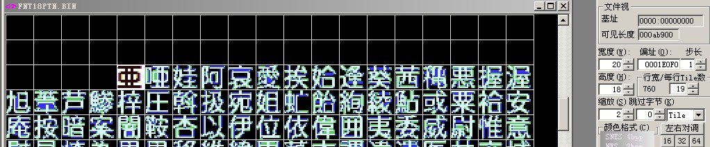 接着怎么做呢?呵呵,这下简单了(按ctri+D调出Tile编辑器修改啦),先别急着按,我们刚才那个码表的代码是先从汉字的889F=亜这开始的,我们要改的话也从这个字库的汉字区域开始比较好点~