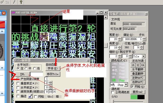 第二个方法:选好字体以后在Tile编辑器的TBL上点一下,她会叫你在载入一个TBL文件,(什么TBL文件啊?笨,就是刚才我们做好的那个新的字库文件)载入以后,看图6