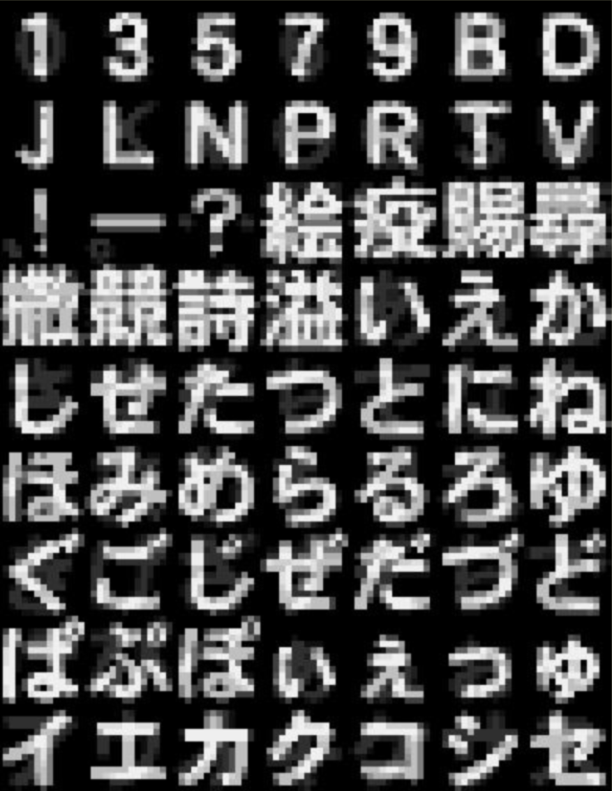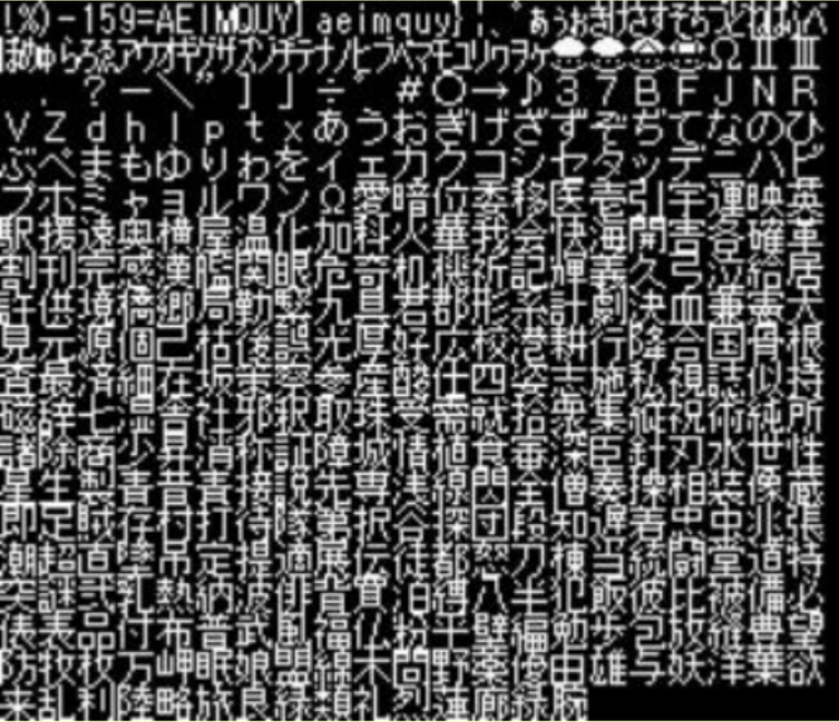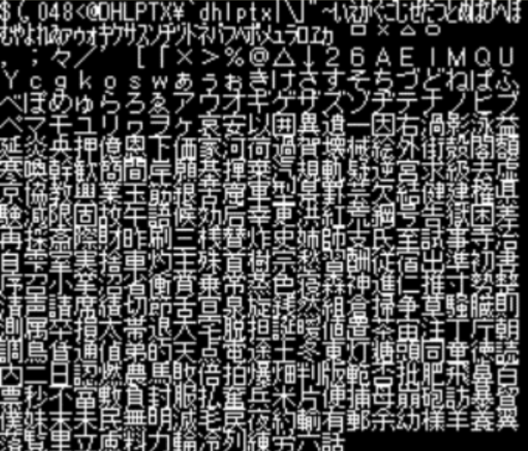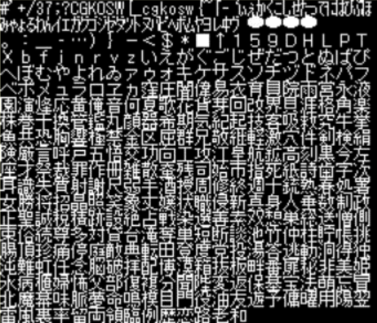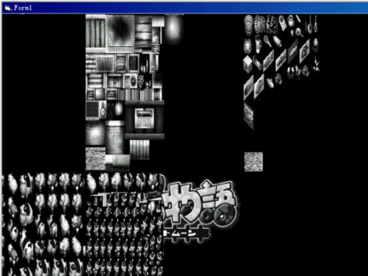 和上面的几个游戏不同,牧场物语的字库不是驻留在PS的主存中的,而是以贴图的形式存在于PS的显存中的,也就是说,我们可以在AdriPSX的即时存档文件的头部找到这些数据,事实上我们可以把整个PS显存看成一个宽度为2048的256色位图来显示和查找其中的字库,不过由于我还依然不清楚PS贴图在光盘中的压缩存放格式,所以暂时还无法汉化此类游戏。下图就是用程序显示的PS显存中的内容,因为没有使用正确的调色板,所以是黑白的。