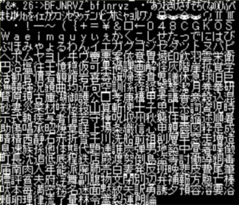 很显然,这个图片和我们在“妖精战士Ⅲ”中找到的字库类似,也缺少了部分的字符,但如果仔细观察的话会发现,这些字符是以较暗的颜色隐藏这的。具体的原因不在此浪费篇幅说明了,想知道详细情况的话可以看看本教程附带的字库显示程序源代码。要顺便说明的是该游戏还有另外一个字库,有兴趣的可以自己找找看。