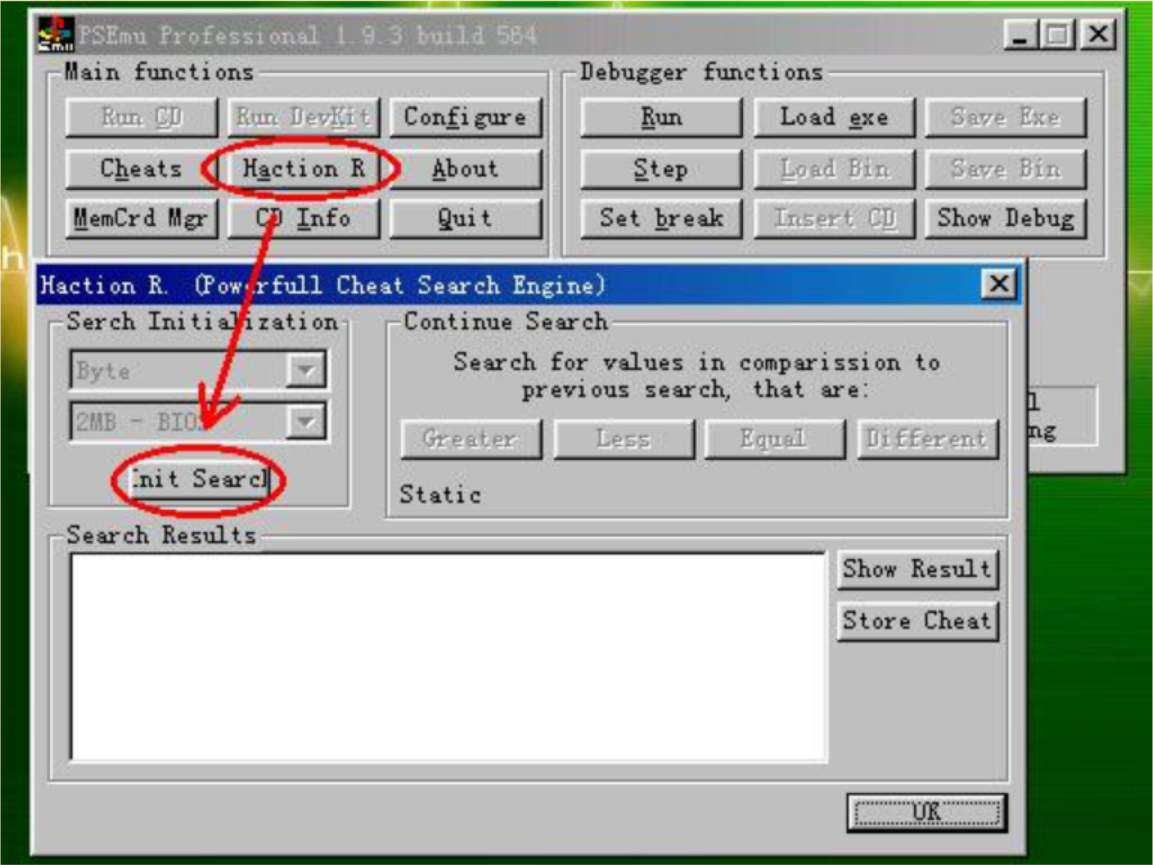 首先我们先使用PSEMU PRO来运行你所要汉化的游戏(具体的配置和使用方法我不多说了,大家可以看网上的相关资料。),当屏幕上出现你所感兴趣的东西的时候(通常我会选择出现我要查找的对话时),按ESC键暂停游戏回到软件的主画面,然后点击“Haction R.”按钮,再点击弹出窗口中的“Init Search”按钮,这时在PSEMU PRO的运行目录中的HactionR子目录中就会生成一个大小为2兆的名为Prevsrch.hcr的文件,这个文件就是PS在暂停运行时的内存影像。