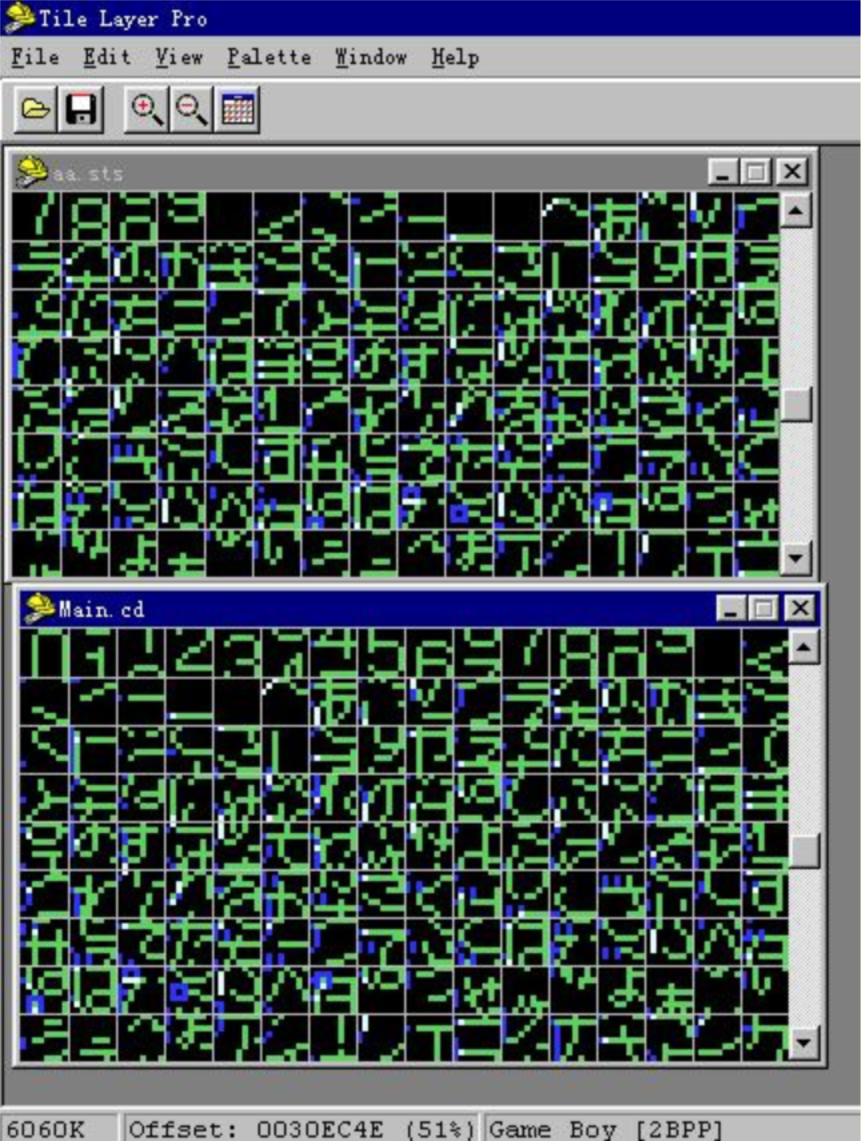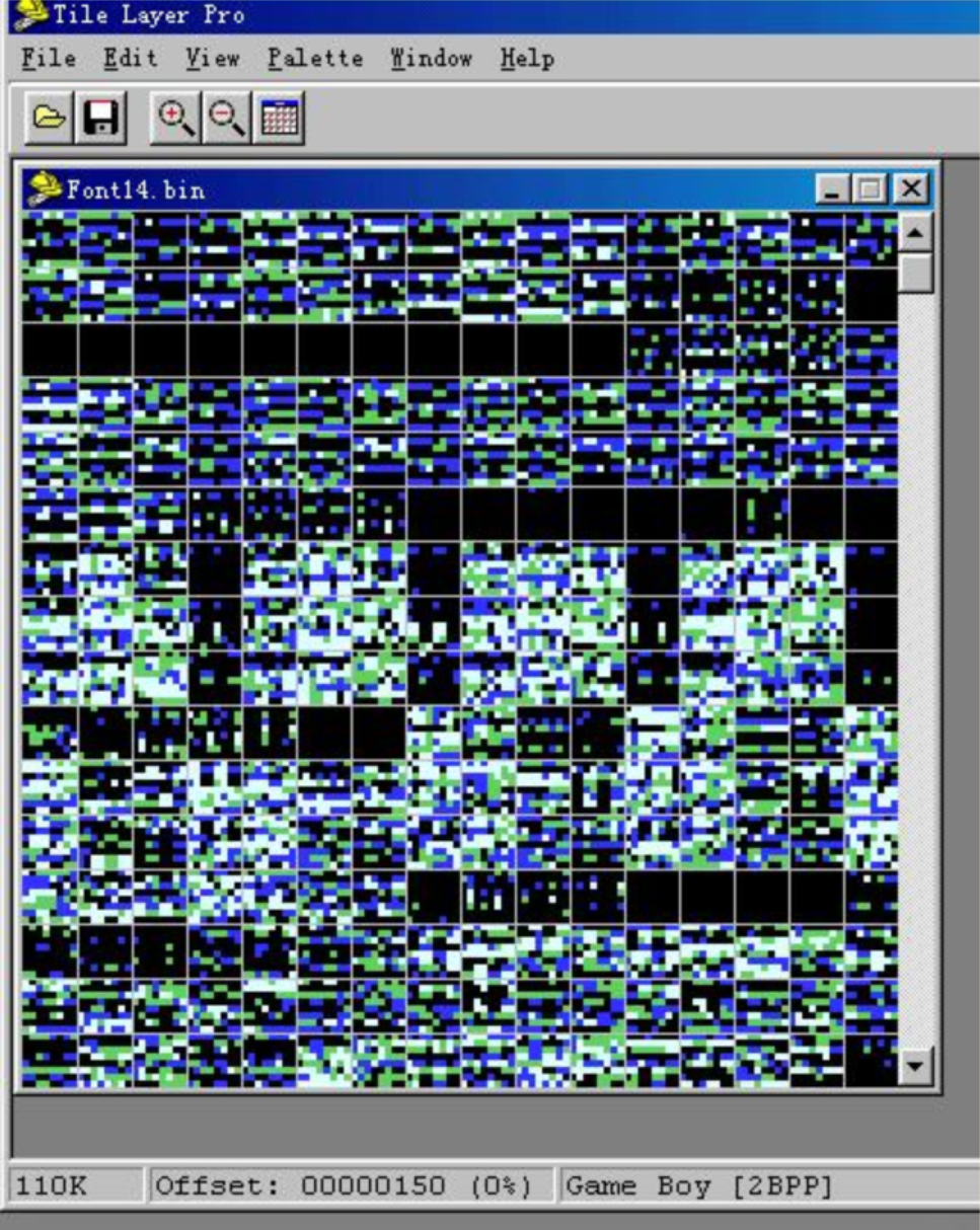 虽然光盘中的文件都被设置成了隐藏的,不过使用前文提到的方法我们依然可以轻松的看到它们,在MENU目录中我们可以找到一个有趣的文件Font14.bin,显然它应该是一个字库文件,而且是应该用于菜单显示的,而那个14我推测应该是表示字体是14X14的吧。通过观察游戏的运行画面我们可以肯定这一点,而且可以发现字体是4色(2BPP)的。但是使用TPL观察会发现结果相当混乱,看不到任何的字体。