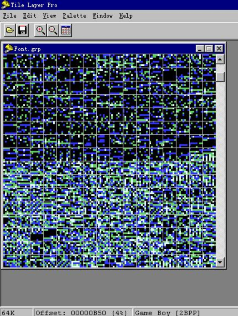 可能因为都是SQUARE的作品的缘故,光盘的目录格式和上面的“放浪冒险潭”非常类似,在Event目录中我们可以找到Font.bin这个字库文件,而且很类似的用TPL也无法看清楚任何字体。通过观察游戏画面我们可以知道如果包括阴影的话字体是10X13的4色(2BPP)字体,事实上我们可以将该字库看作宽度为5的4色位图来显示。