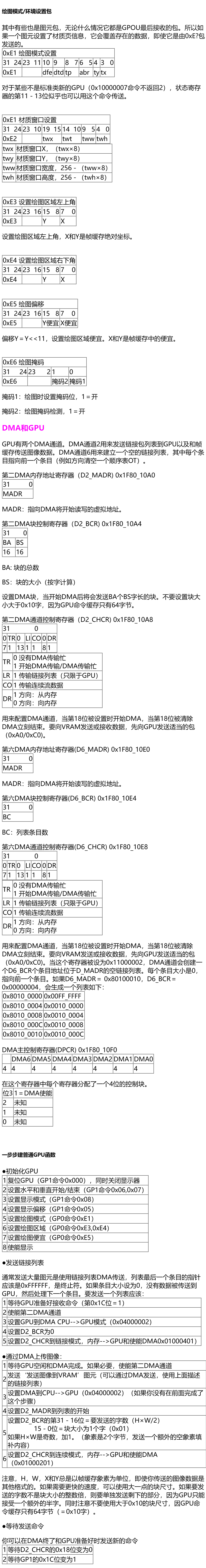 1MB的帧缓存不能被CPU访问,只能通过向GPU发送命令或者DMA传送数据。它有一个64字节的命令FIFO缓存,可以保存3条命令,它连接到一个DMA通道用来传送图像数据和链接命令列表(通道2)和一个DMA通道用来反向清楚一个顺序表(通道6)。